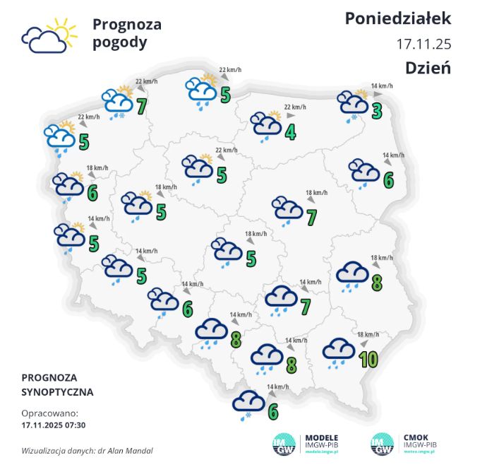 ☁️ Na przeważającym obszarze kraju utrzyma się zachmurzenie duże, a miejscami całkowite. Jedynie na północnym zachodzie możliwe będą większe przejaśnienia i lokalne rozpogodzenia.