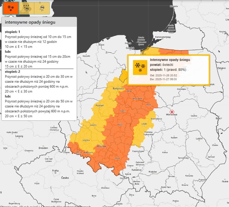 Uwaga nowe ostrzeżenia meteorologiczne - intensywne opady śniegu stopień: 1 przebieg: prognozowane są opady śniegu powodujące przyrost pokrywy śnieżnej o 10 cm do 15 cm